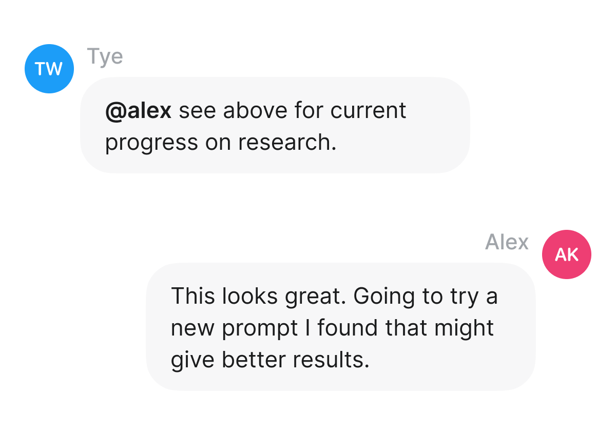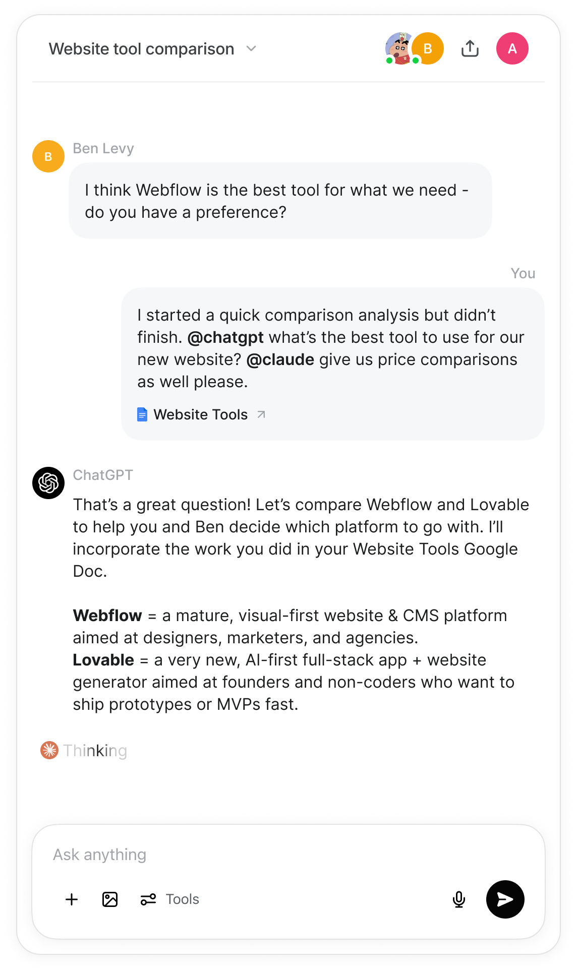 No more copy/pasting outdated ChatGPT links. Have a single thread with shared context your teammates can continue the conversation from.