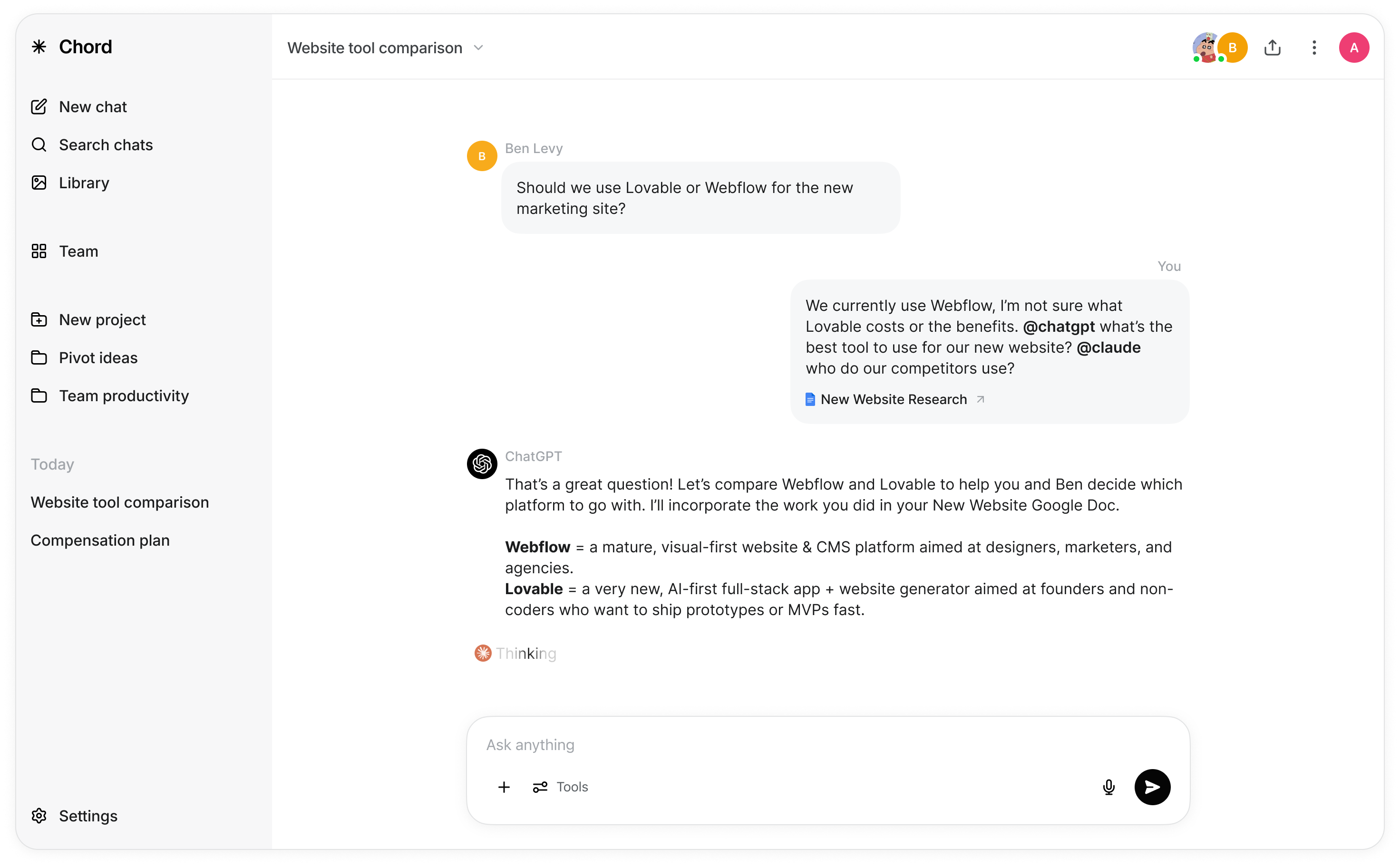 Collaborate with teammates and the leading AI models in a single chat interface.